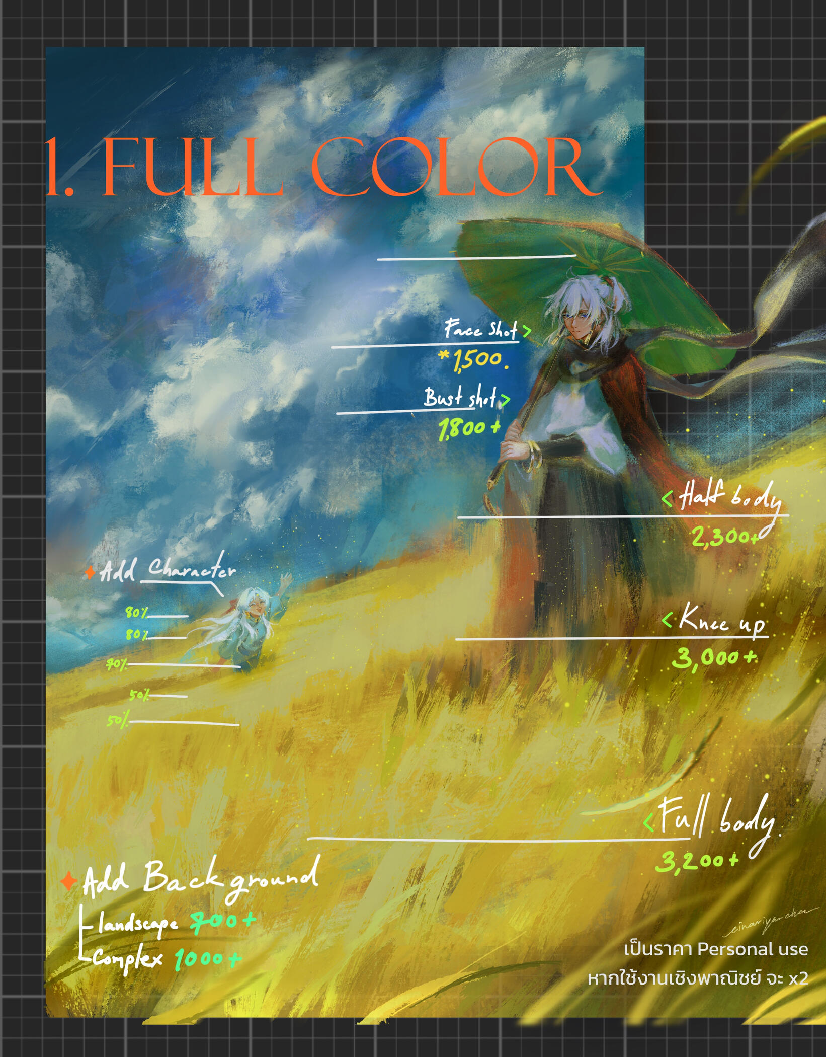 • เพิ่มตัวละครในรูปเดียวกัน บวกเพิ่ม 80%, 70%, 50% /ต่อตัวละคร ตามสเกล นั้น ๆ✦ สำหรับฉากหลัง(ถ้ามี) จะมีการบวกเพิ่มในส่วนของสิ่งของหรือสิ่งปลูกสร้างที่มีความซับซ้อนต่าง ๆ อยู่ที่ประมาณ 300 - 700 - 1000 (พิจารณาแล้วแต่บรีฟ)